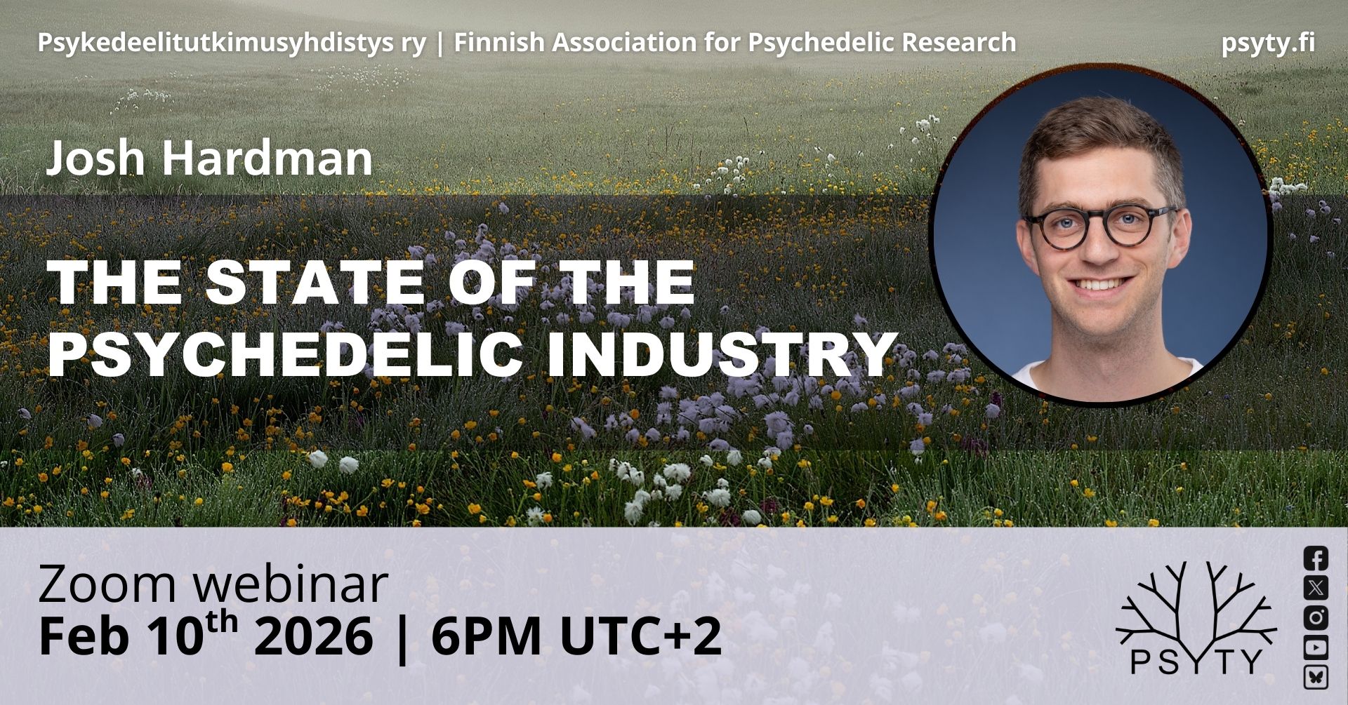 Yksi psykedeelikentän ansiokkaimmista tutkimusten kirjoa, lupaprosesseja, liiketoimintaa ja patentteja seuraavista analyytikoista on Psychedelic Alpha -sivuston perustaja ja päätoimittaja Josh Hardman. Psykedeelitutkimusyhdistys ry:n helmikuun 10. järjestämässä webinaarissa Hardman tarjoaa ajantasaisen katsauksen psykedeelien lääkekehityksen ja sääntelyn tilaan. Hän esittelee luennollaan muun muassa sitä, mitkä ovat psykedeelitutkimuksiin sijoitettavan rahoituksen keskeisiä kohteita, psykedeelien kliinisen käytön oleellisia kehityslinjoja, alaan kohdistuvaa lobbaustoimintaa ja poliittista ilmapiiriä, psykedeelien lääkekäyttöä koskevaa yleistä mielipideilmapiiriä sekä hoitomuotojen saatavuutta.